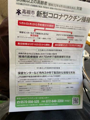 今朝に郵便ポストの中を見ると、こんなパンフが入っていた。 居住する高槻市での新型コロナのワクチン接種についてのものである。と言っても私が受けられる訳ではなく、65歳以上の高齢者 (昭和32年4月1日以前生まれ) 対象ということ。5月6日(木)から予約受付…