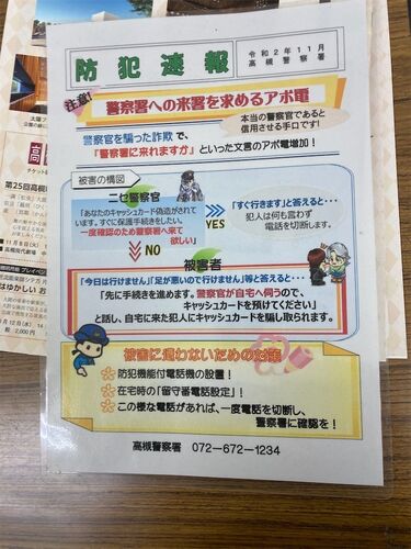 相変わらず特殊詐欺が蔓延っている。単純なものもあるけど、新種もどんどん現れている。 高槻警察署から来たポスターである。 要するに警察官を詐称してカード類を騙し取る手口である。NOと言ったら、それを目的として来所してくる。何しろ警察だと伝えるの…